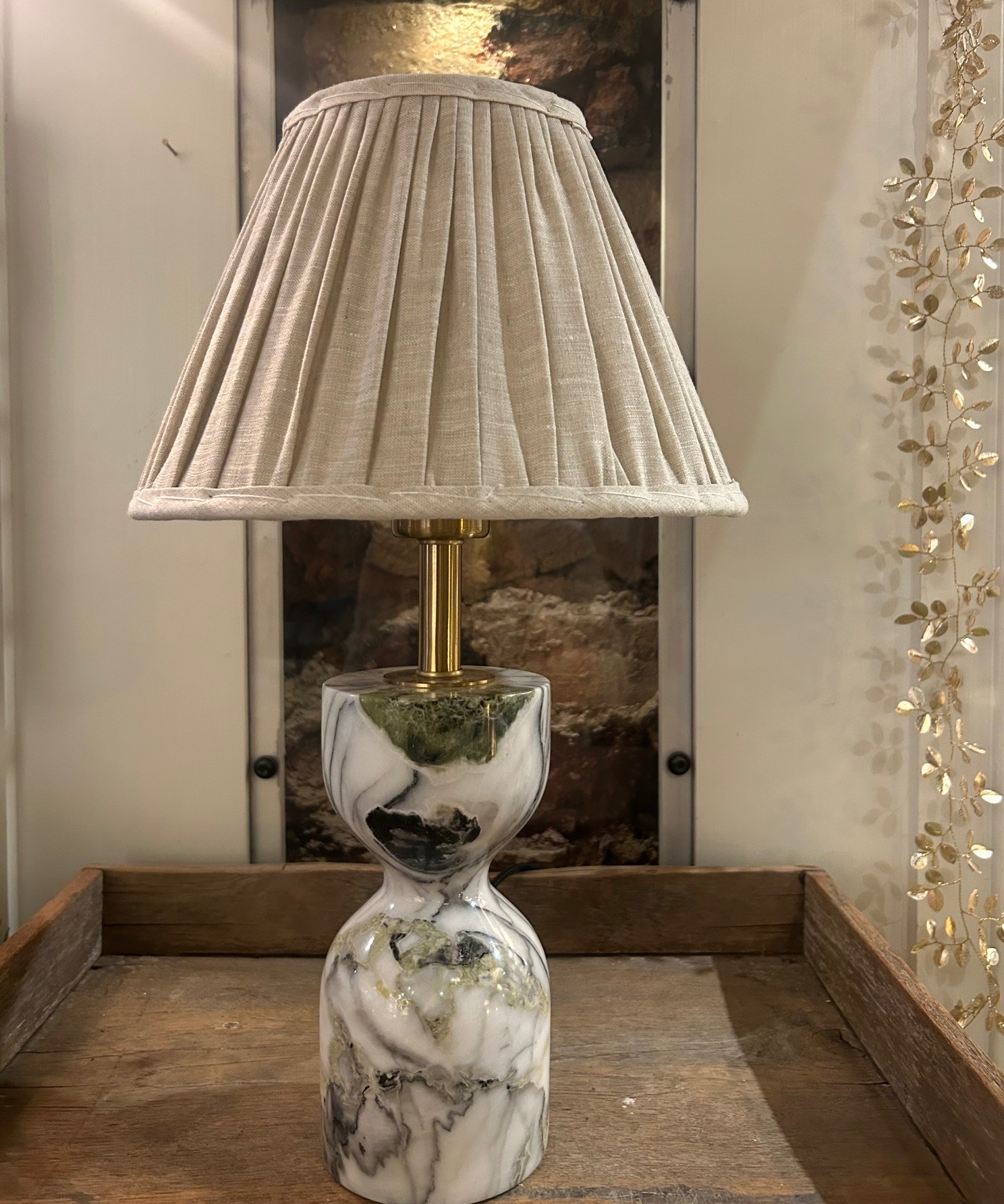 Stilren bordslampa i grön/grå marmor. Eftersom marmor är ett naturmaterial ser ingen lika ut och kan därmed skilja sig från den på bilden.