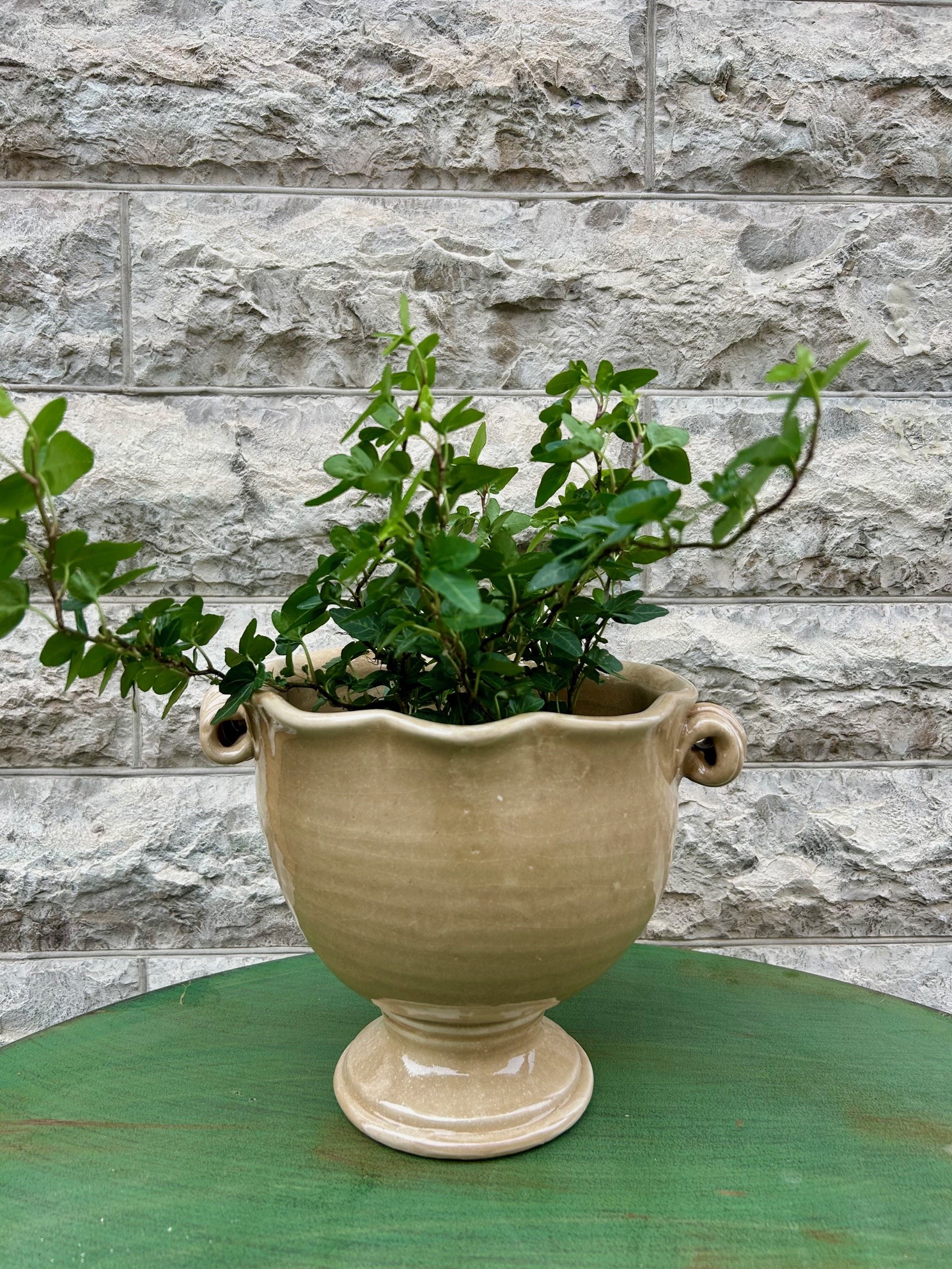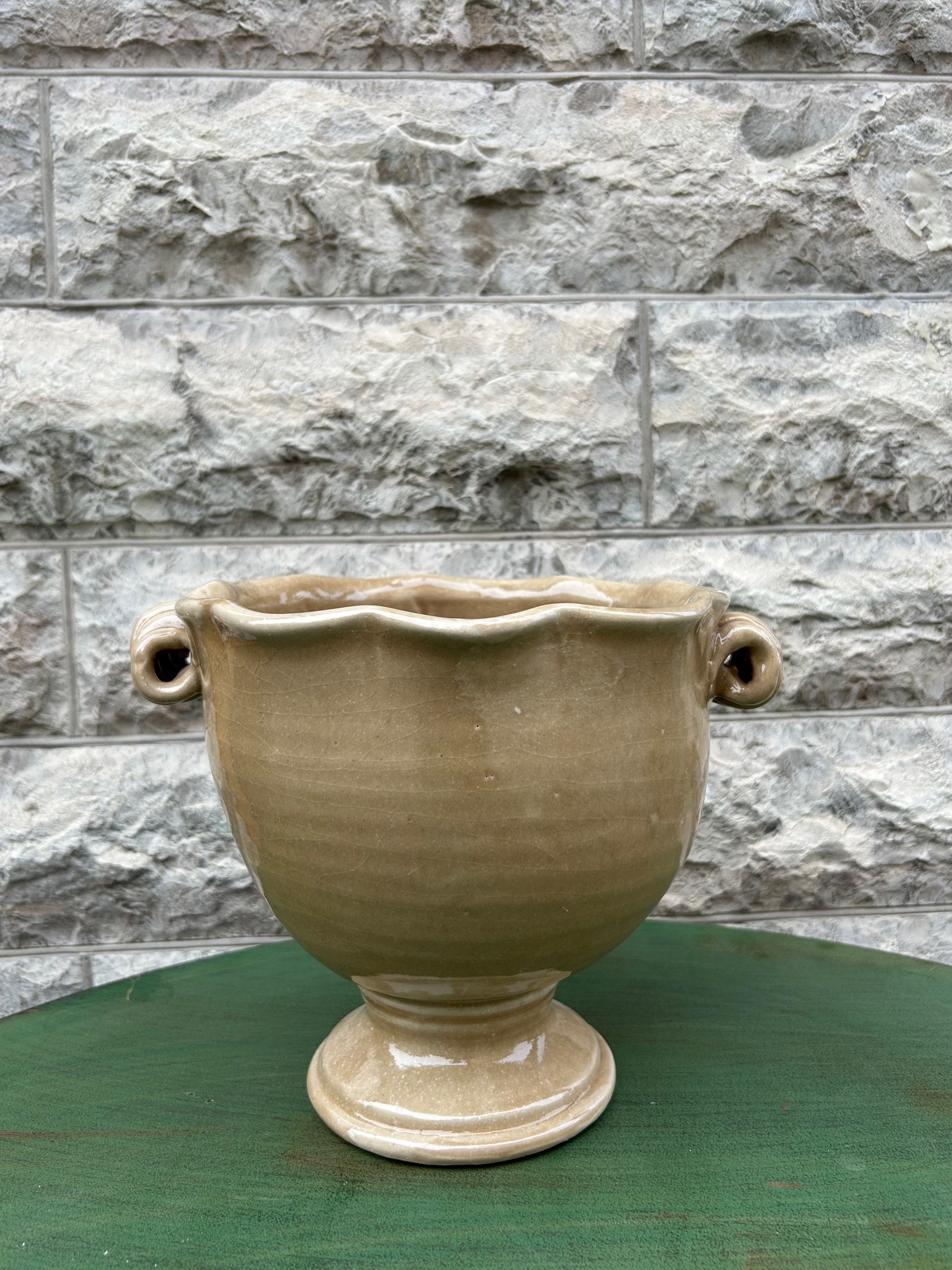 Vacker klassisk kruka på fot i glaserad keramik, färgen är en svag saffran färg. Ojämnheter förekommer i krukan då produkten är handgjord och varje exemplar är unik.