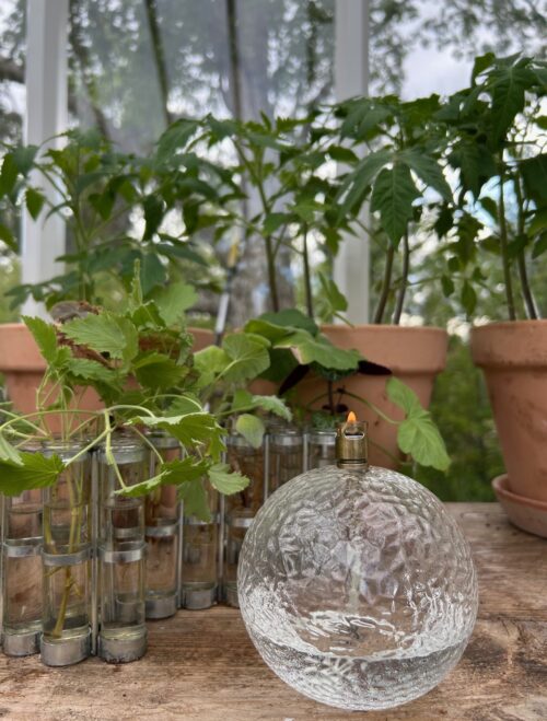 Veken är gjord av glasfiber och behöver ej bytas ut. Fyll behållaren med lampolja upp till 3/4 i glaset.