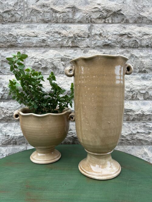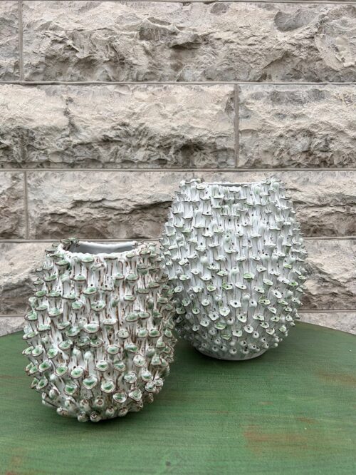 Bouqutiere Vas tillverkad av den danska keramikern Erik Bendtsen . Vasen är handdrejad och unikt glaserad i en mjuk, marmorerad färg. Klassisk vas på fot med dekorativa lejonhuvudutsmyckningar, upptill ligger ett vackert lock med hål för varje blomma. En vas med en tidlös form och ett modernt uttryck.