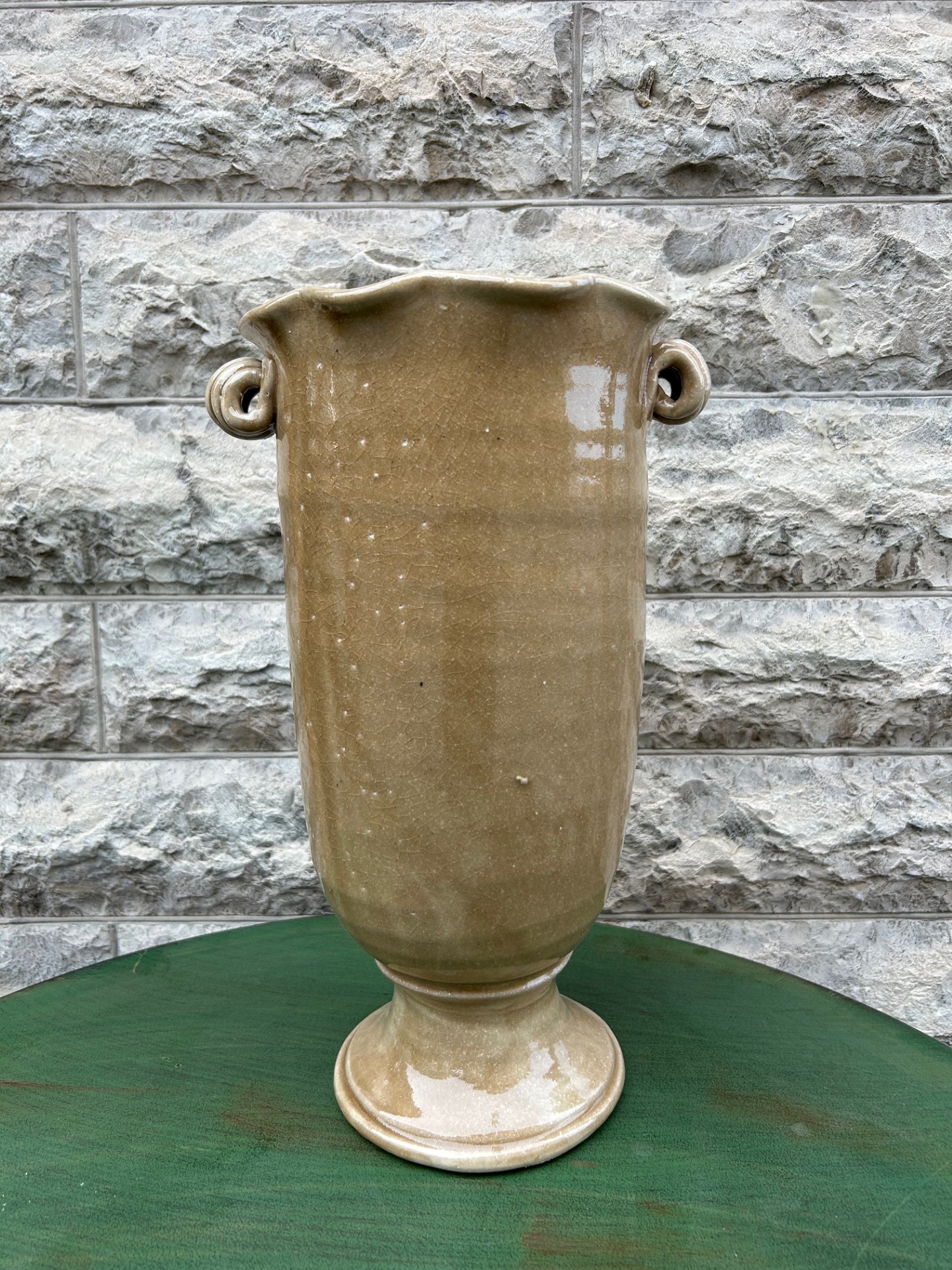 Vacker hög kruka/vas på fot i glaserad keramik, färgen är en svag saffran färg. Ojämnheter förekommer i krukan då produkten är handgjord och varje exemplar är unik.