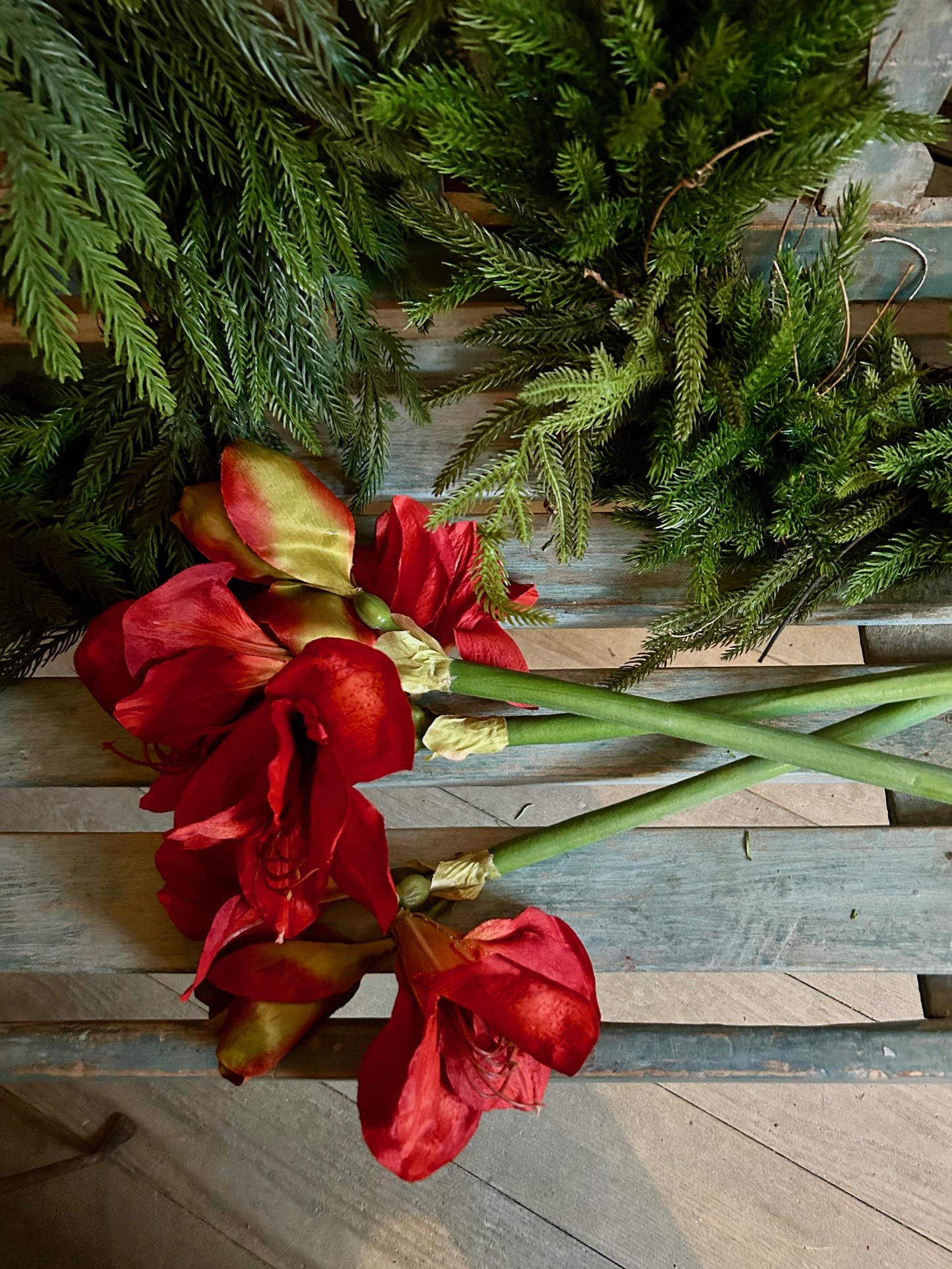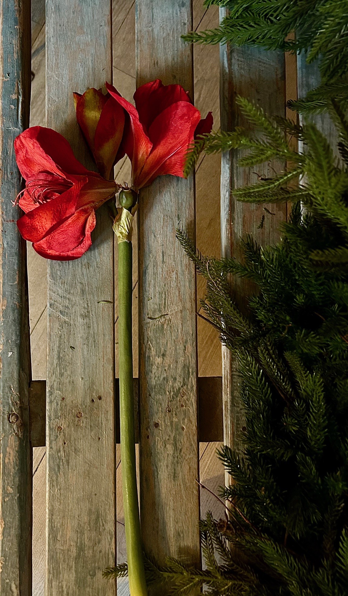 Röd konstgjord Amaryllis som ser otroligt äkta ut. Amaryllisen har 2 utslagna blommor och 1 kraftig knopp. En konstgjord snittblomma att ta fram år efter år.