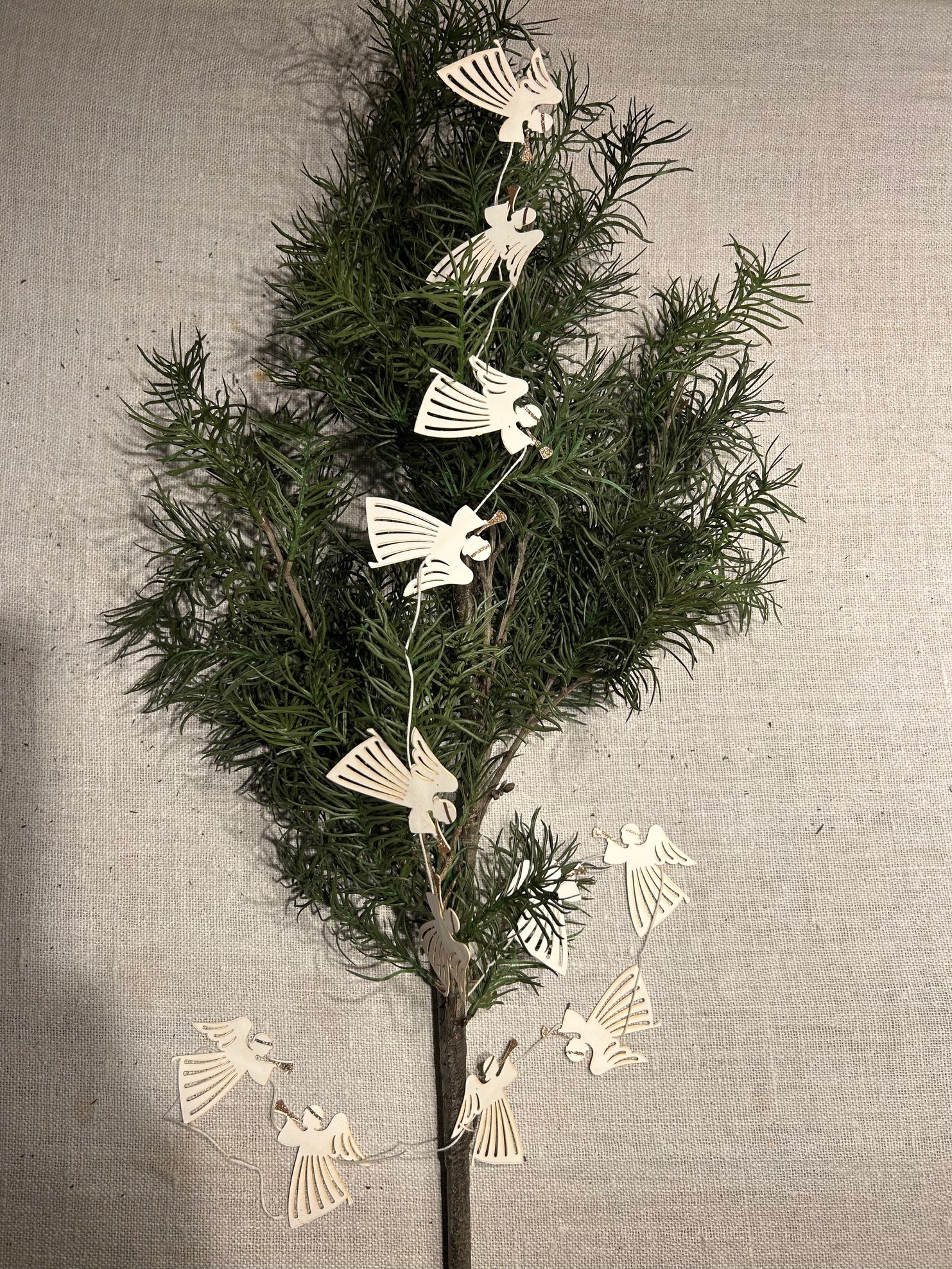 Charmig änglagirlang med guldglitter och invecklade utskurna detaljer.