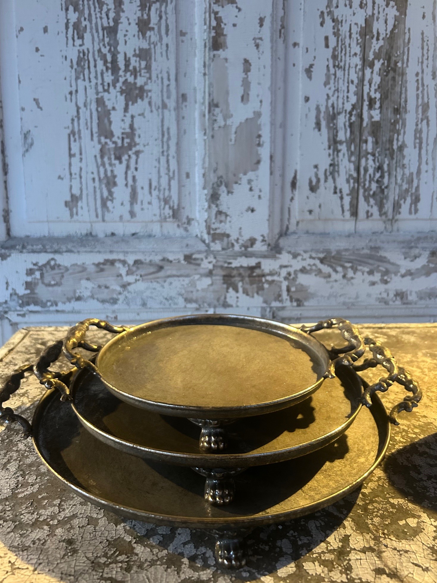 Metallbricka med handtag och tassar, finns i tre olika storlekar. Vi tycker att brickor i det här utseendet blir en fin detalj i hemmet, fint att ställa en glasvas med blommor på eller en vacker blomkruka, perfekt som ljusbricka eller för att göra ett vackert stilleben etc.
