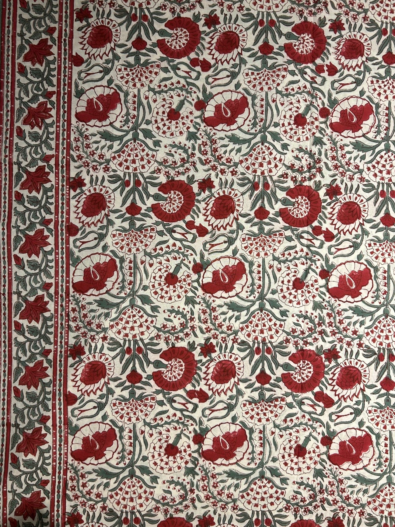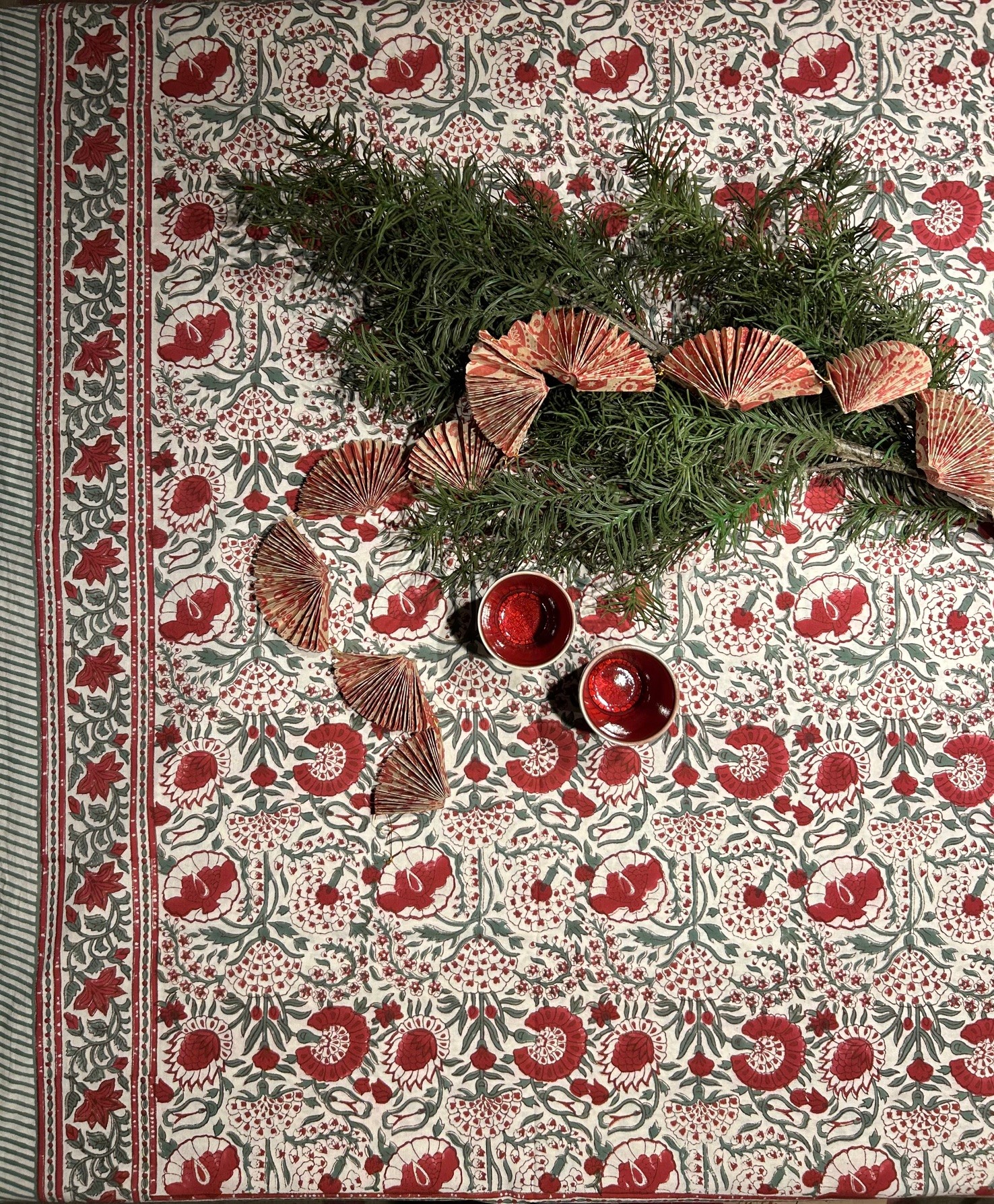 Clavel som betyder nejlika på spanska är en blocktryckt bordsduk med indisk blommönster i rött och grönt.