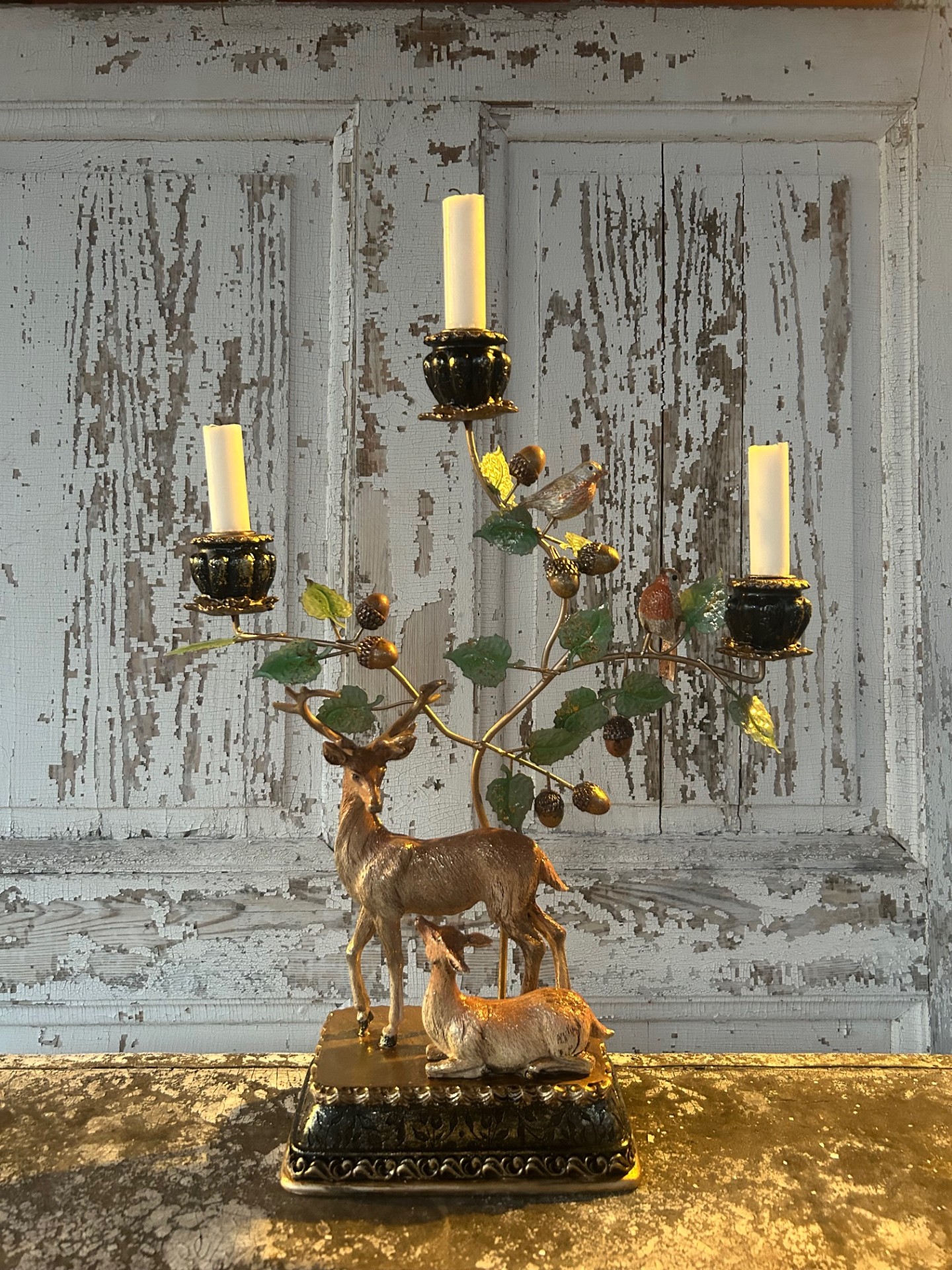 En ståtlig och personlig ljusstake tillverka i metall och polyresin. Deer ljusstake har tre stycken ljushållare för kronljus. En ljusstake som tar lite plats i både form och uttryck