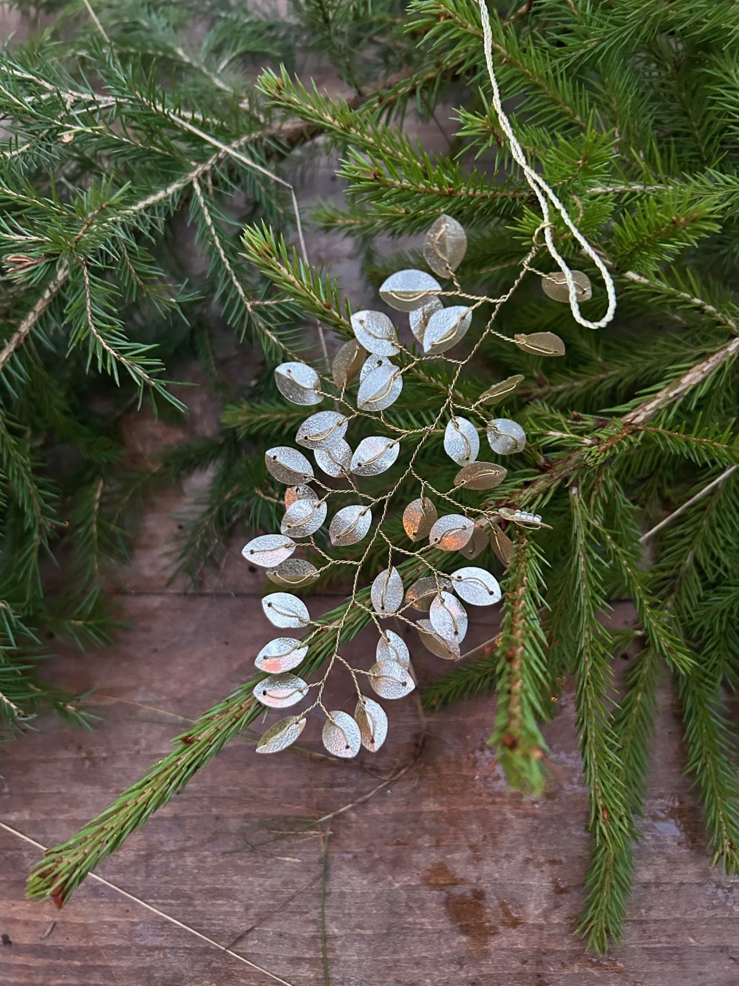 Liten söt metall kvist med små lövtunna blad i champagne färg, fin att hänga lite varsom.