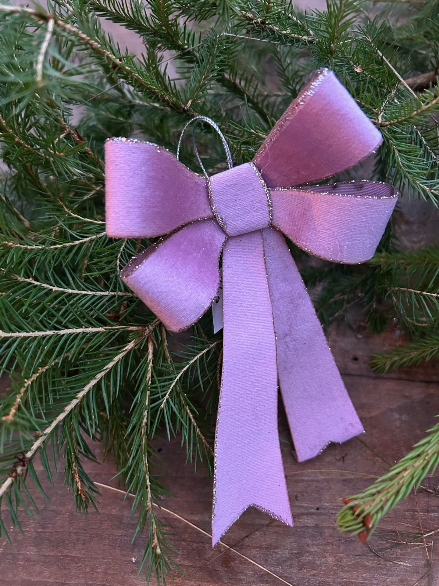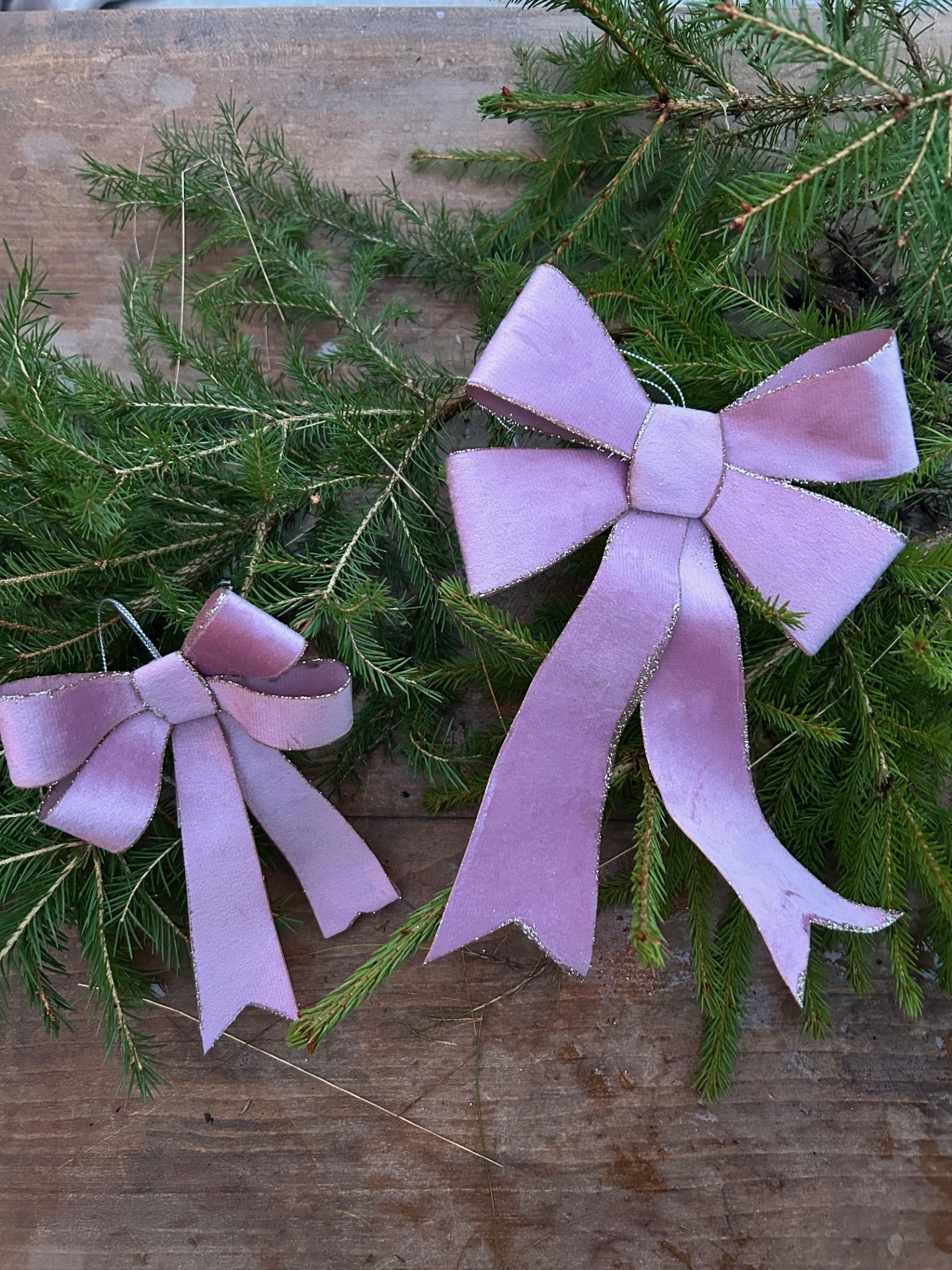 Sammetsrosett i rosa med champagneglitter, fin att hänga i gran eller kvistar. Dekorativ att hänga på ett dörrhandtag/ett gammalt skåp, bara fantasin sätter gränser. Rosetten har ett tunt snöre så den är lätt att hänga upp.