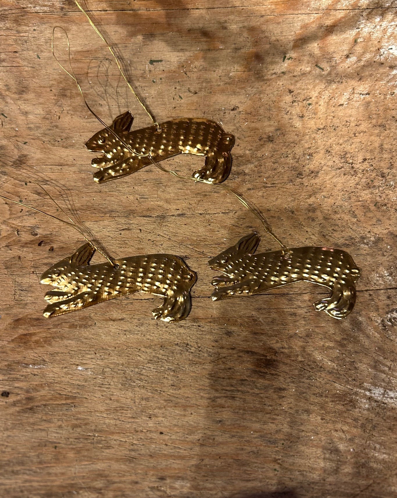 Söta små harar i gjuten mässing i antik finish som blir fina i kvistar/påskris. Setet innehåller tre harar med medföljande upphängningstråd.