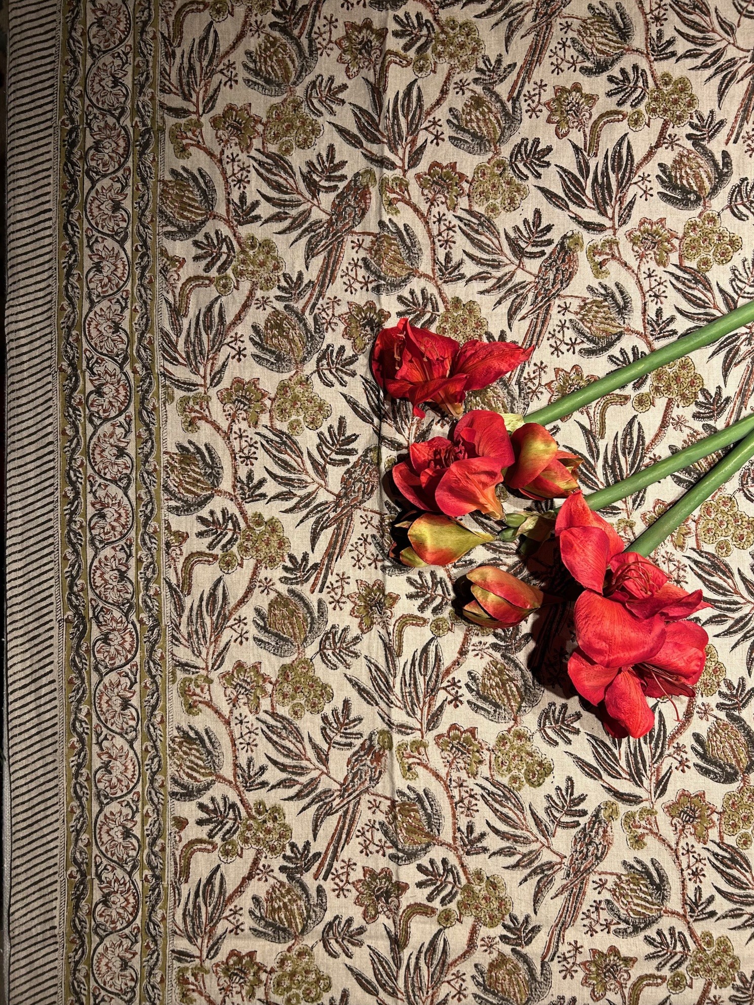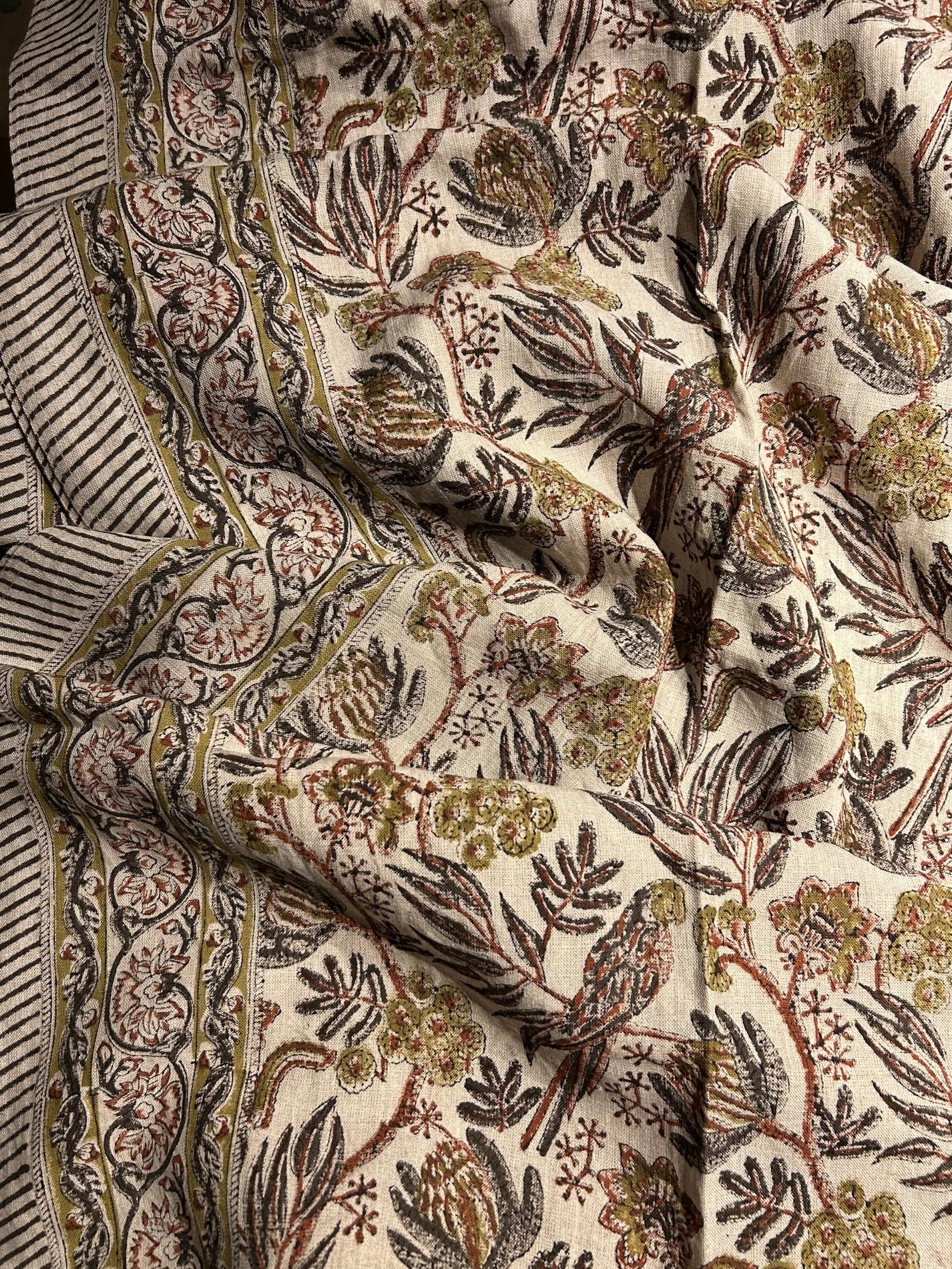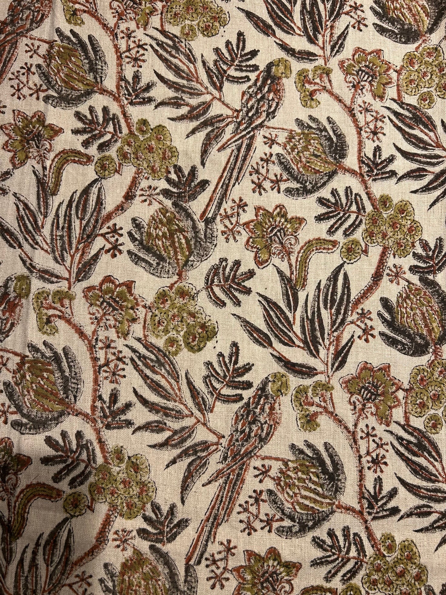 Den vackra linneduken Parrot i en varm roströd ton förhöjer din dukning och med dess alla sobra nyanser av rostiga toner blir det enkelt att tillsätta vilka färger som helst. Denna eleganta duk hyllar orientaliska textiltraditioner genom handtryckt mönster som ger varje exemplar ett unikt uttryck. Tillverkad i oblekt linne av hög kvalitet, med vacker tyngd, naturlig struktur och djup i både färg och mönster.